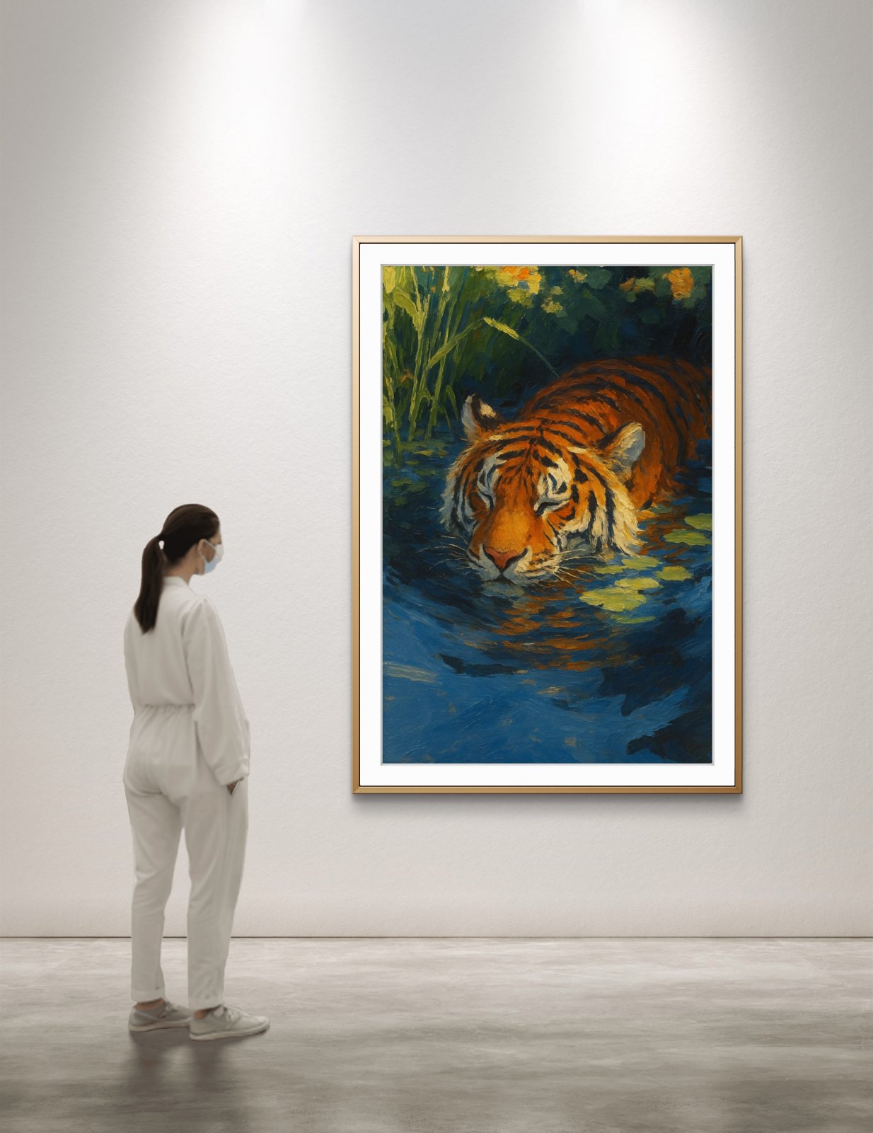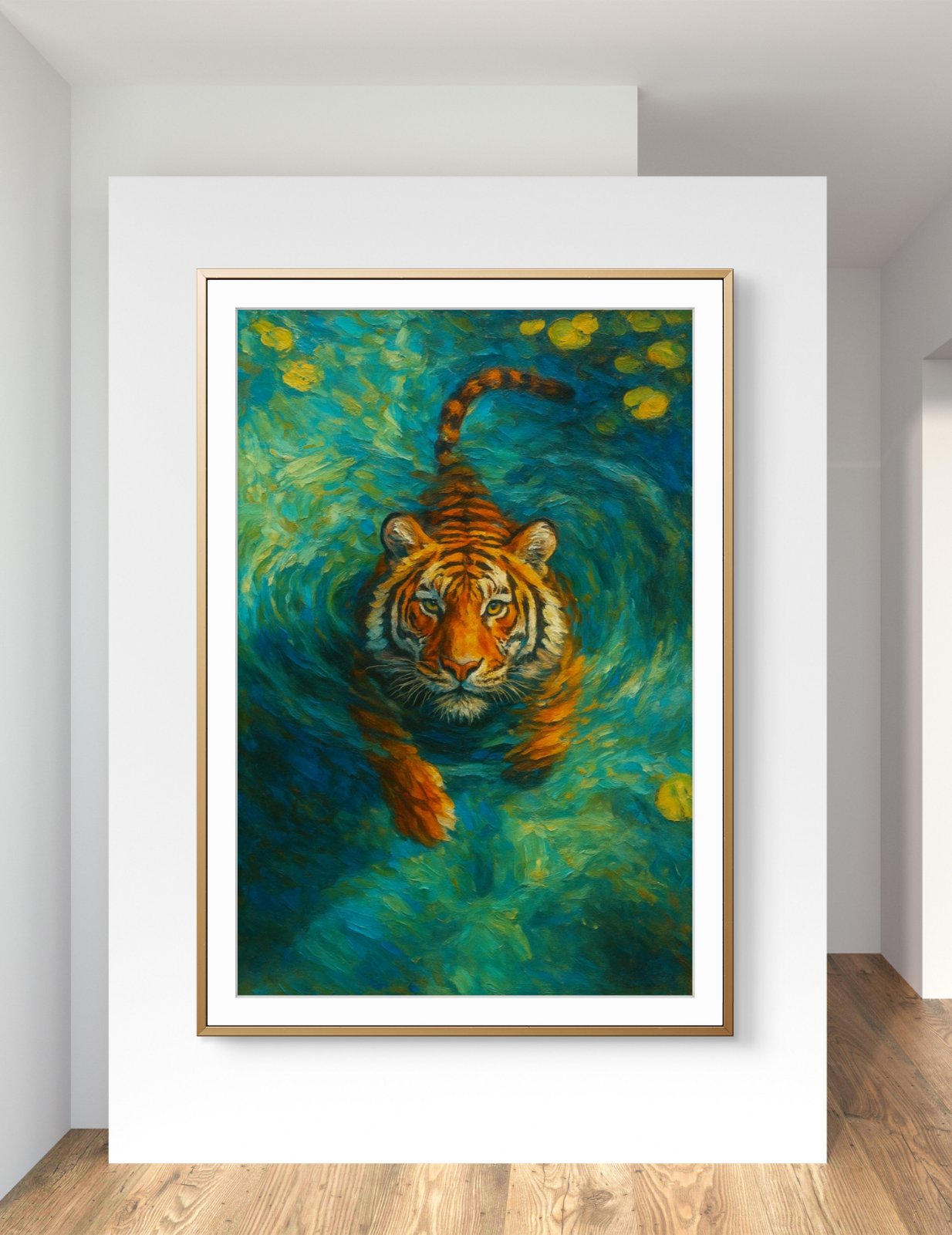 This dynamic painting depicts a tiger swimming gracefully through vibrant blue waters, its eyes focused and intense. The rippling water swirls around the powerful form of the tiger, its vivid orange and black stripes creating a striking contrast against the tranquil blue backdrop. Splashes of yellow and green from water lilies add an ethereal quality to the scene. The tiger’s serene yet determined expression conveys both strength and calm, embodying the majesty and grace of the wild. The artwork captures a rare moment of tranquility for a creature typically known for its fierce presence, highlighting its beauty and elegance in motion.