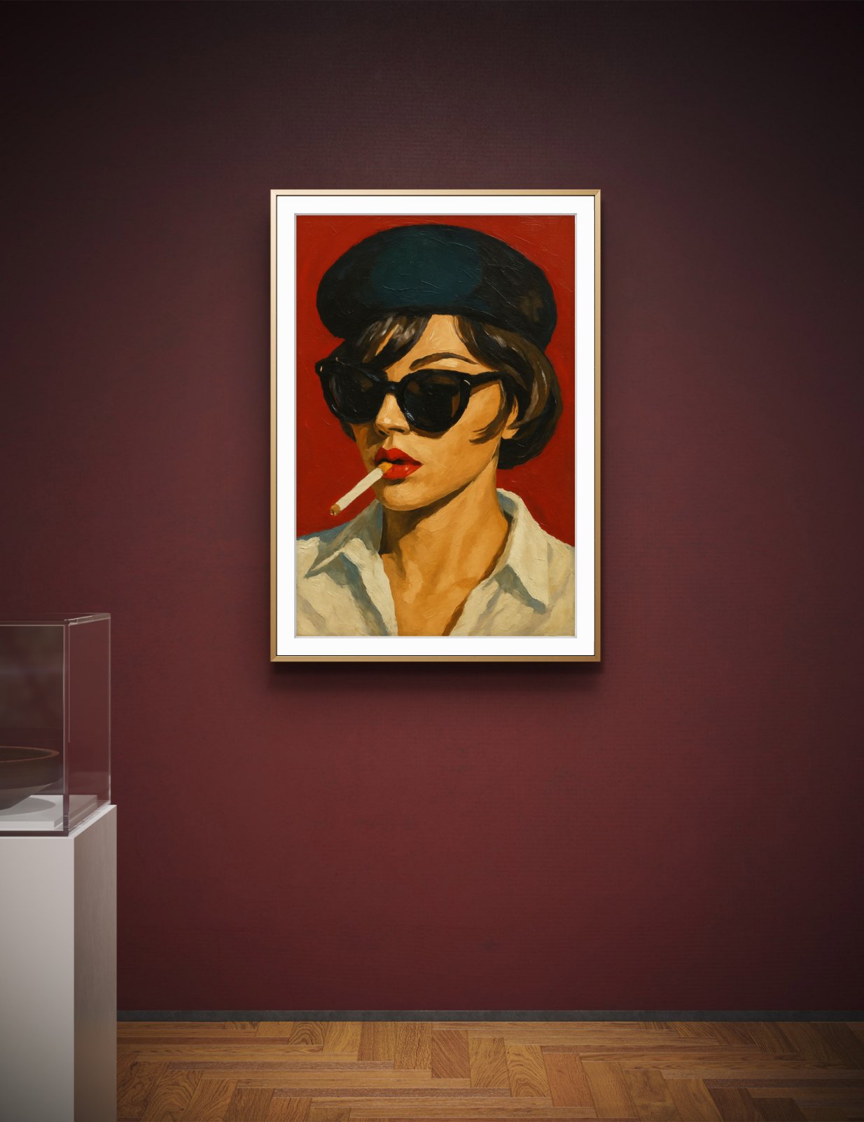 This striking portrait features a woman exuding confidence and cool sophistication. With her bold black sunglasses and beret, she embodies an air of mystery and rebellion. The bright red background contrasts vividly with the softer tones of her skin and white shirt, drawing attention to her strong features and fierce gaze. A cigarette hanging from her lips adds to the edgy, carefree attitude of the scene. The textured brushstrokes give the piece a sense of richness and depth, while the minimalistic composition directs all focus on the subject’s presence and allure.