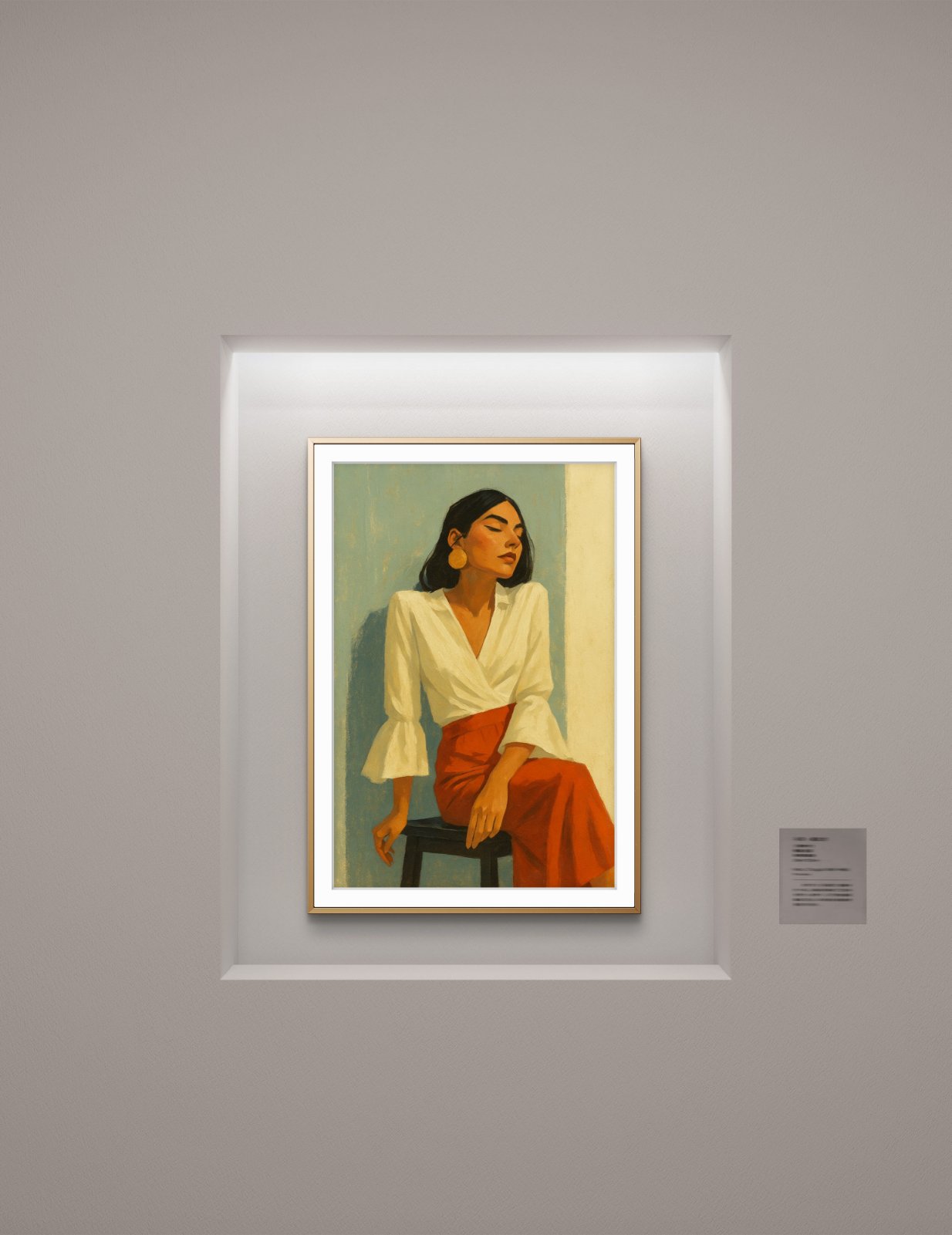 This captivating portrait captures a moment of quiet introspection. The woman, dressed in a simple white blouse with bell sleeves and a flowing red skirt, sits gracefully on a stool, her eyes closed in serene contemplation. The soft, muted blue background enhances the warm tones of her skin and the rich red of her skirt. Large gold earrings add a bold touch to the simplicity of her outfit. The minimalist composition and subtle light evoke a sense of peaceful solitude, as if the subject is lost in her own thoughts, embodying a sense of calm elegance and quiet beauty.