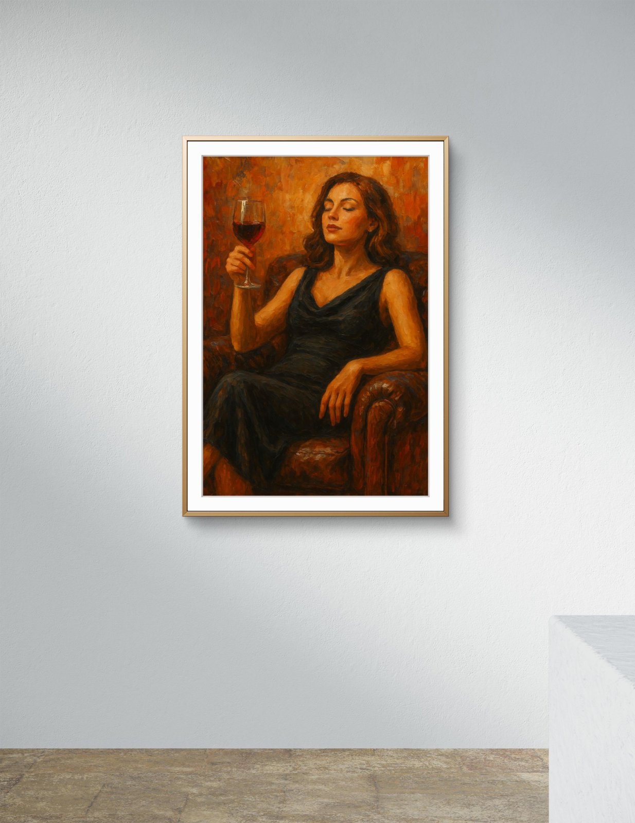 Rendered in warm, textured brushstrokes, this oil painting captures a serene and introspective moment of a woman enveloped in quiet luxury. Seated in a plush leather armchair, she holds a glass of red wine with elegance and poise, her eyes closed as if savoring the aroma or the stillness of the moment. The rich, earthy tones of the background blend harmoniously with the deep hues of her black dress and the wine, evoking warmth, depth, and a sense of timeless indulgence. A celebration of self-reflection and peaceful solitude, the piece invites the viewer to pause and embrace the beauty of presence.