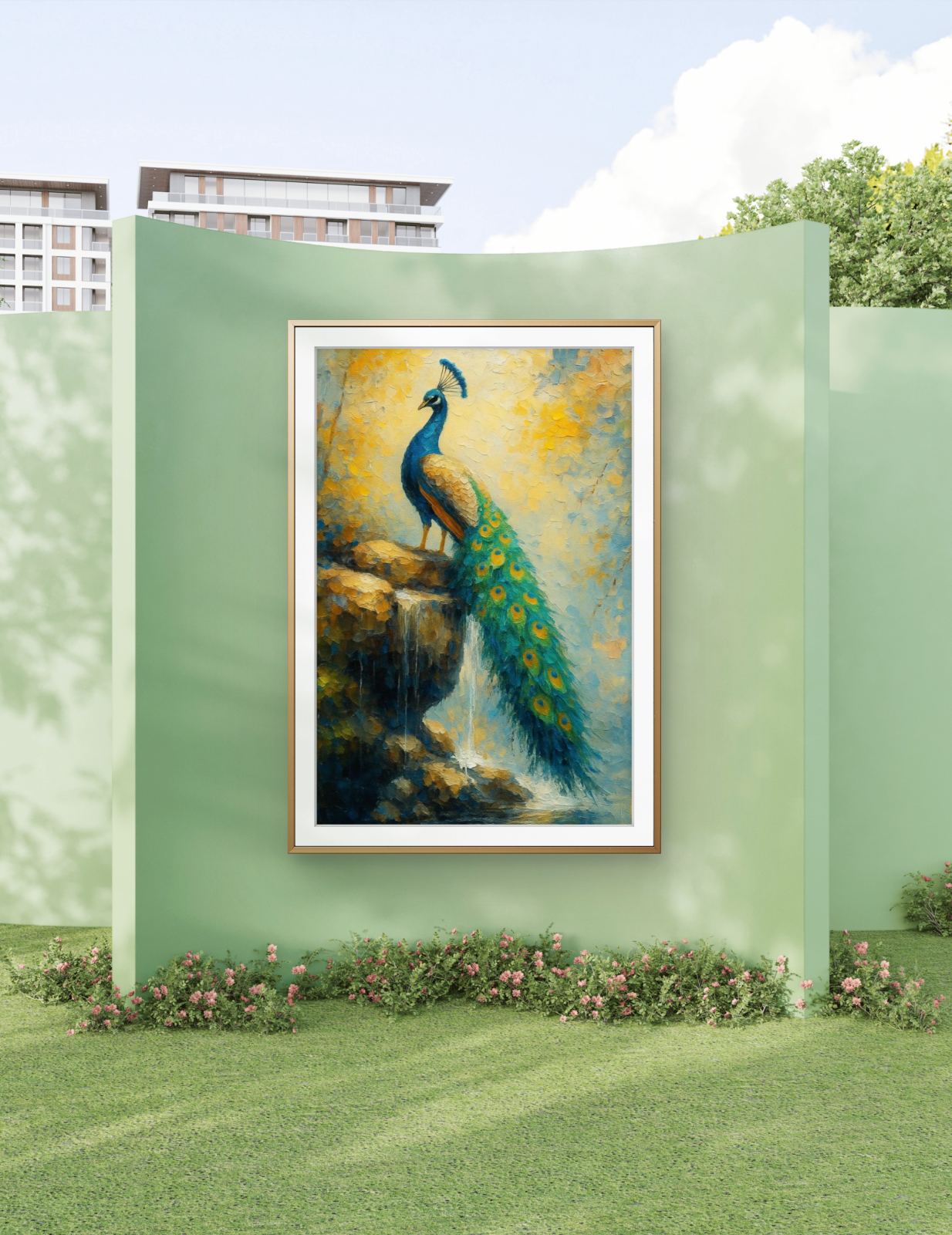 In this stunning artwork, a peacock stands proudly atop a rock, its vibrant plumage cascading down in a magnificent display of color. The rich blues, greens, and yellows of its tail feathers stand in beautiful contrast against the softer, golden background. A waterfall flows gently in the background, enhancing the serene and majestic atmosphere. The peacock’s poised stance and regal presence are captured in vivid detail, reflecting its natural elegance. The painting’s textured brushstrokes and harmonious colors evoke a sense of tranquility and splendor, celebrating the beauty and grace of this magnificent bird.