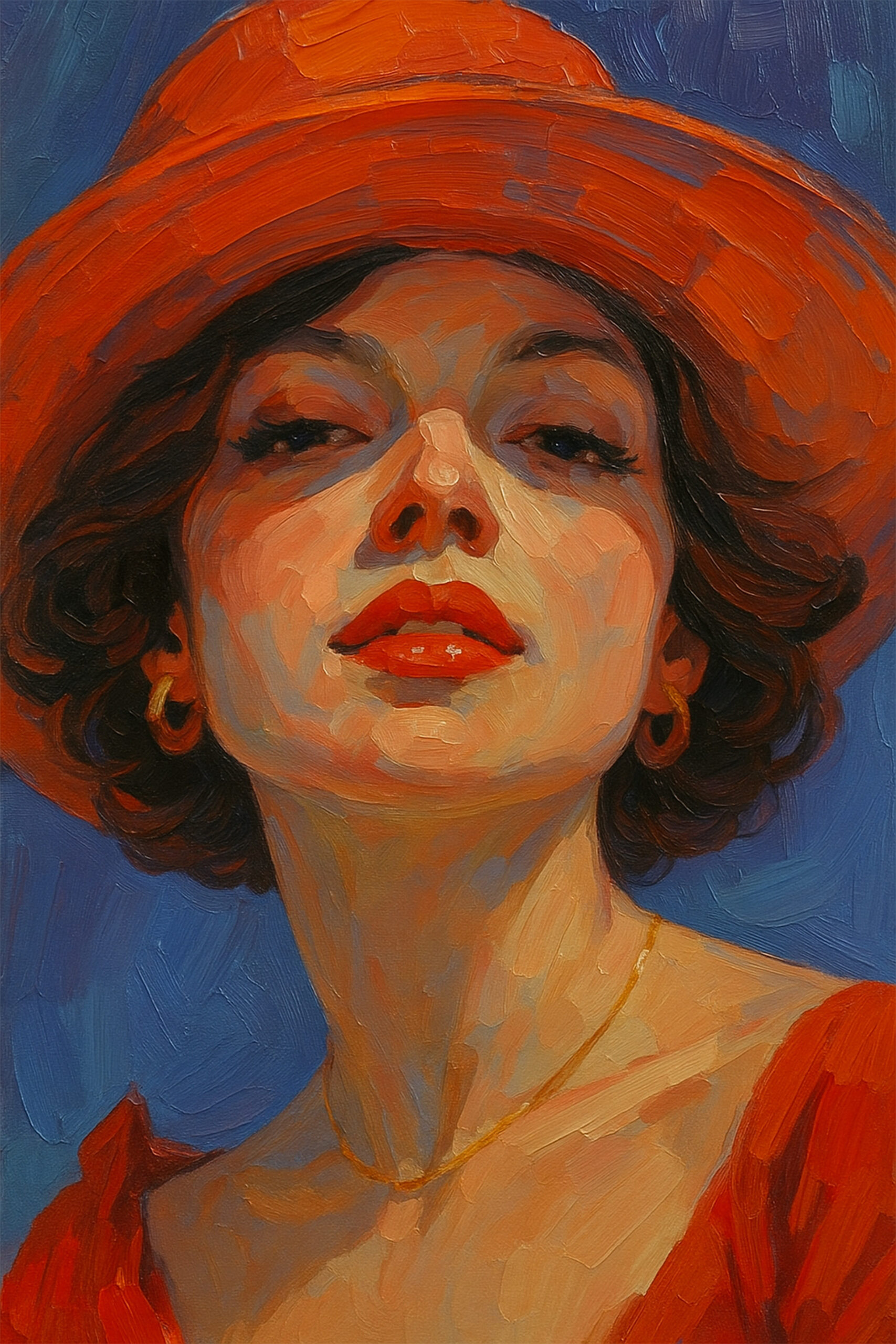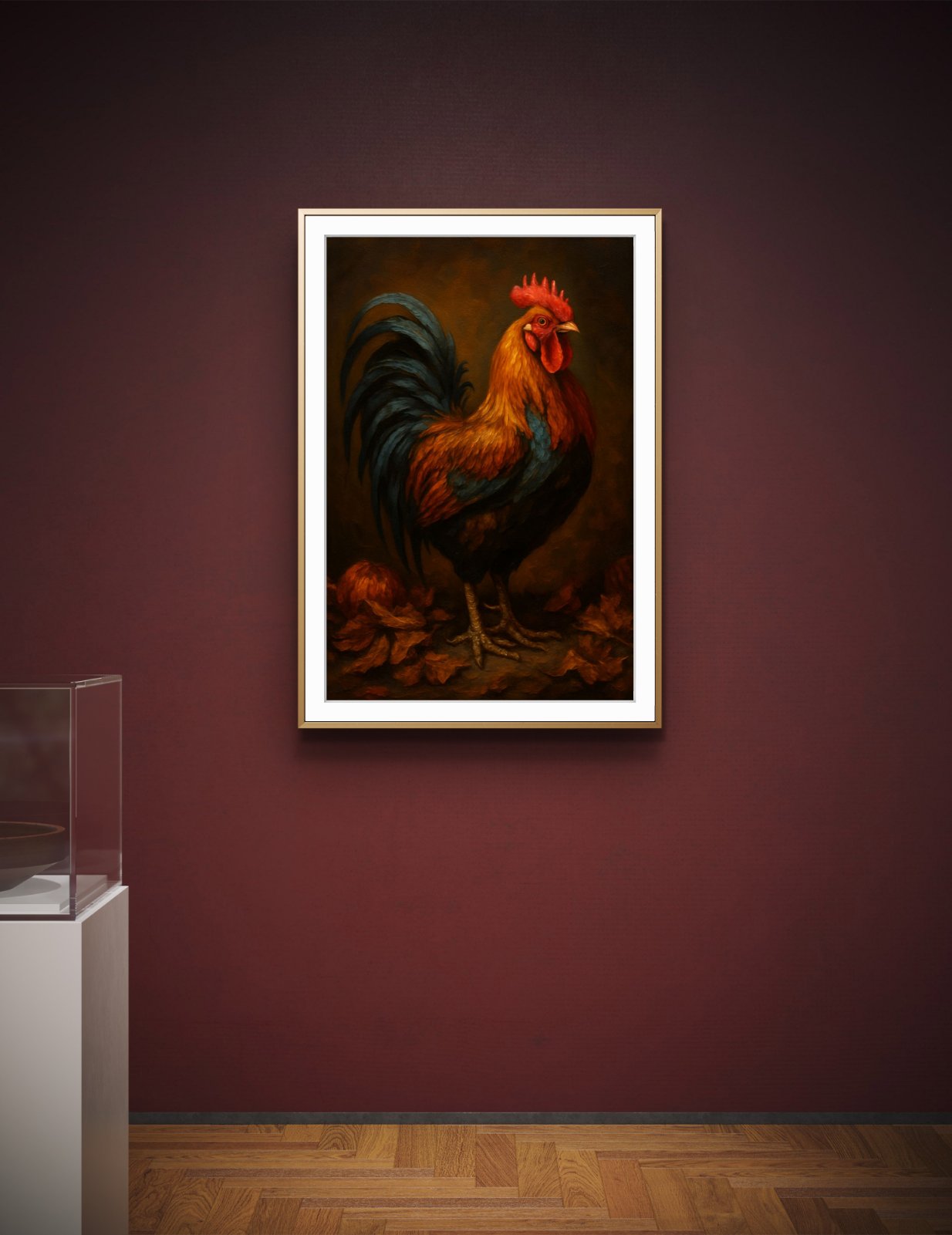 100 €Bold and majestic, this oil painting showcases a proud rooster standing amidst a bed of fallen autumn leaves, exuding strength and vibrancy. The artist uses rich, earthy tones—deep oranges, fiery reds, and dusky blues—to bring the rooster’s plumage to life, creating a striking contrast against the moody, dark background. Every feather is rendered with expressive, textured brushstrokes, emphasizing the bird’s regal posture and commanding presence. The warm, seasonal ambiance evokes a sense of harvest time and rural tranquility, capturing the timeless spirit of farm life with painterly elegance.