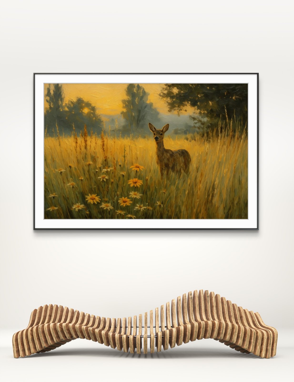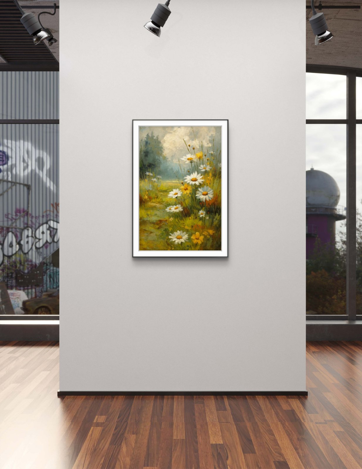 80 €This peaceful oil painting captures a beautiful pathway framed by wild daisies, their delicate white petals and yellow centers standing out against the soft, textured background. The subtle light filtering through the sky casts a serene glow over the meadow, creating a calm and inviting atmosphere. The mixture of wildflowers in warm yellows and greens adds depth and life to the scene. The gentle brushwork and soft colors evoke a sense of tranquility, making this painting a celebration of nature’s simple yet profound beauty.