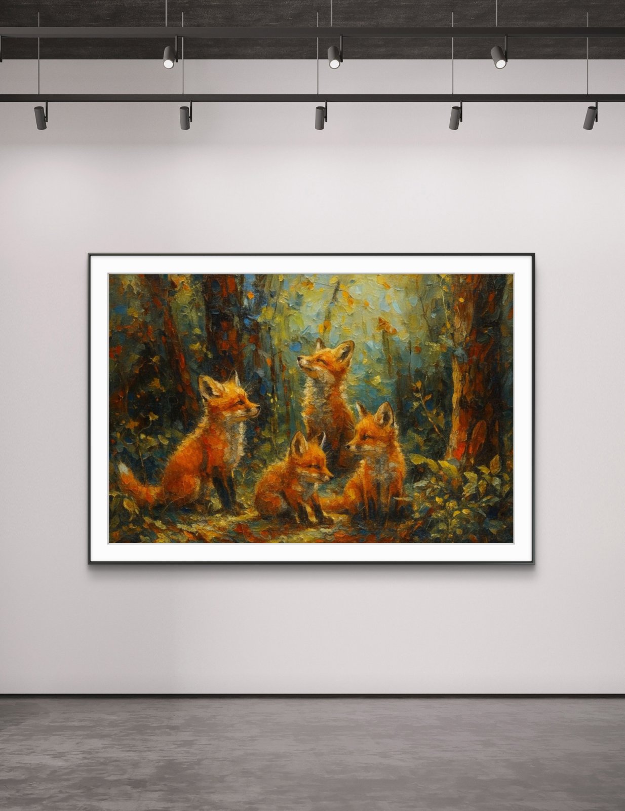 80 €This charming oil painting captures a moment of quiet serenity in the forest, where a family of four foxes are gathered together. Their vibrant orange fur contrasts beautifully with the rich green and blue tones of the surrounding woodland. The soft brushwork creates a sense of warmth and harmony, as the foxes, each with its own curious expression, seem to be engaged in a silent, shared moment. The dappled light filtering through the trees adds to the peaceful, natural beauty of the scene, evoking a sense of connection with the wild.