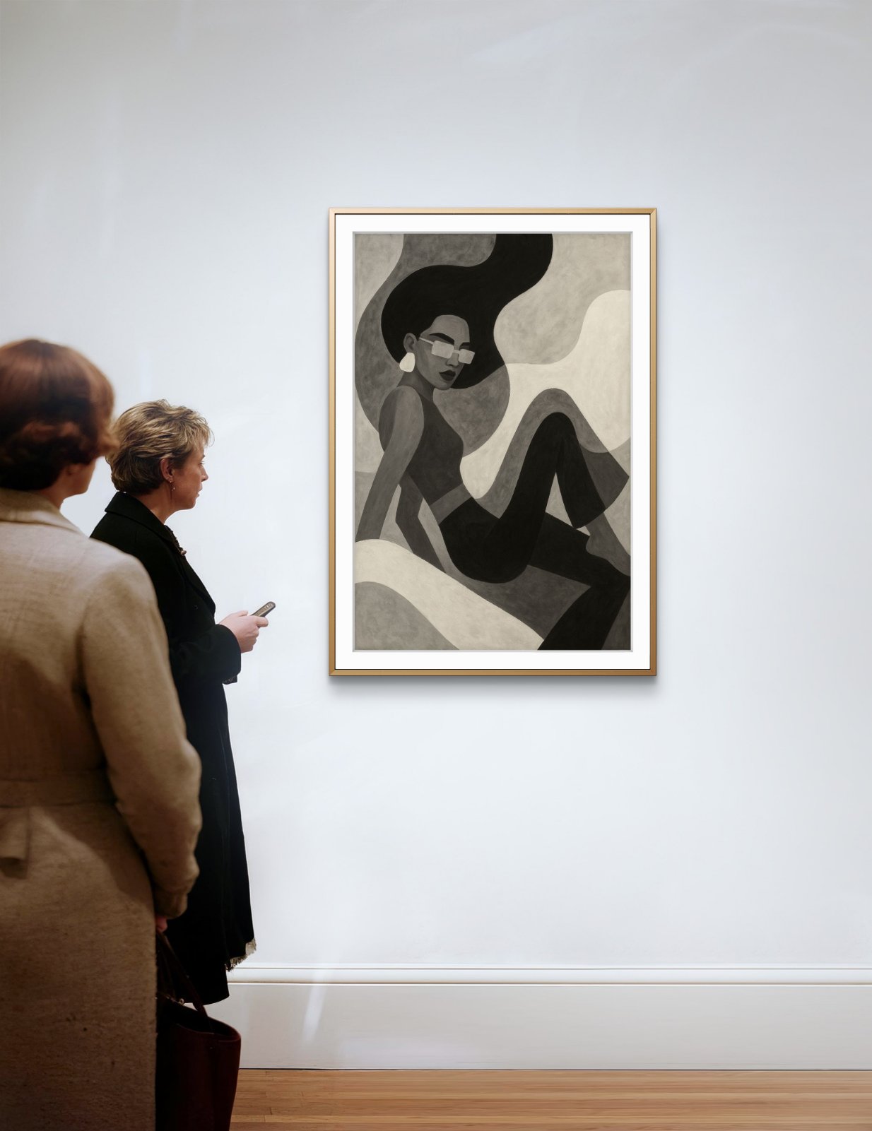 100 €This captivating black-and-white artwork presents a bold and stylized portrait of a woman in a modern, minimalist aesthetic. The figure is surrounded by fluid, curving lines that emphasize movement and grace, creating a sense of harmony between the subject and her surroundings. Her sunglasses and oversized earrings add a touch of sophistication, while the flowing lines of her hair and body convey confidence and poise. The high-contrast tones of black, gray, and white lend a timeless elegance to the piece, making it a striking visual study of form and style.