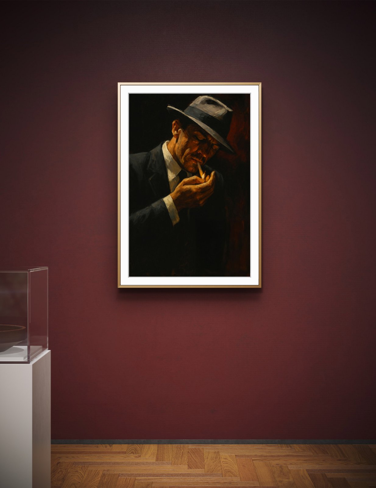100 €This evocative portrait captures a fleeting moment of intense concentration, as a man in a classic fedora lights his cigarette. The interplay of warm light from the glowing cigarette against the dark backdrop brings the subject to life, emphasizing his sharp features and strong posture. The rich, textured brushwork conveys a sense of depth, while the subdued palette of dark tones and earthy hues enhances the scene’s moody, cinematic atmosphere. With its noir-inspired essence, this painting evokes a sense of mystery, hinting at an untold story behind the figure’s thoughtful expression.