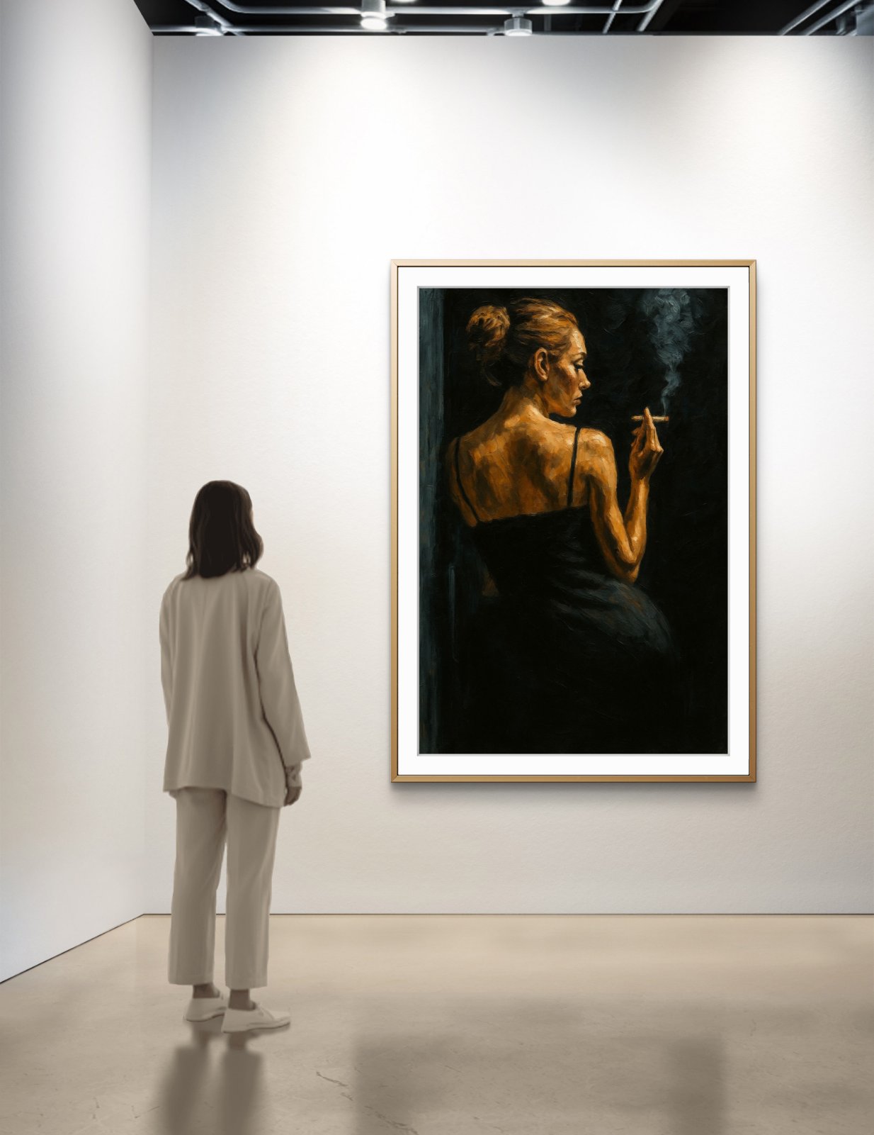 100 €Bathed in the warm, flickering light of an unseen source, a woman sits alone in contemplative silence, her back turned to the world. Draped in a simple black dress, she holds a cigarette delicately between her fingers, the smoke curling into the surrounding darkness like thoughts unspoken. This oil painting captures a moment suspended in time — intimate, moody, and evocative — reflecting themes of solitude, mystery, and inner strength. The rich, textured brushwork and dramatic chiaroscuro evoke the timeless allure of classic portraiture with a modern noir sensibility.