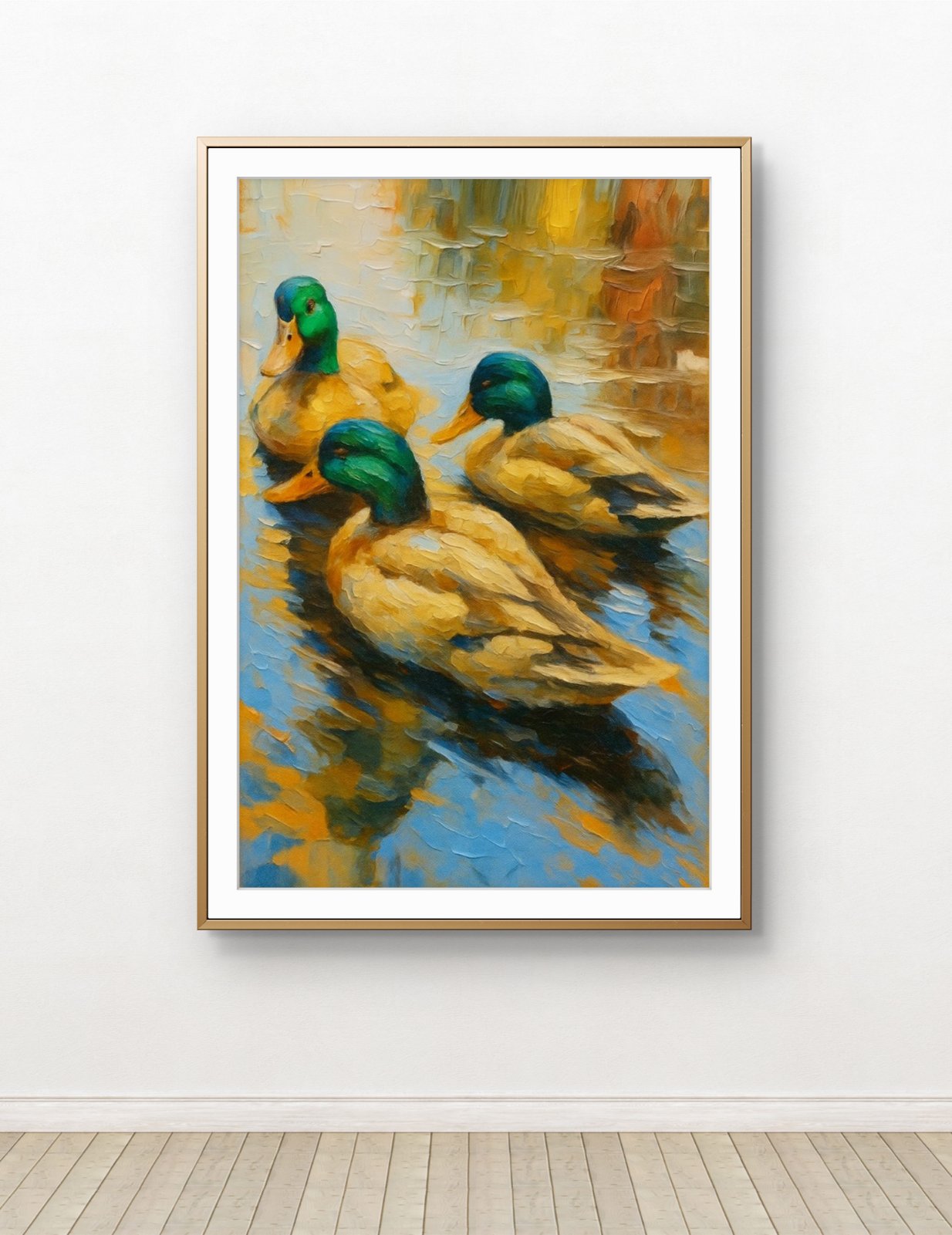 100 €This vibrant painting captures a serene moment of three mallard ducks gliding gracefully across a calm body of water. The ducks’ striking green heads and golden bodies are beautifully reflected in the rippling surface, creating a peaceful harmony between the birds and their surroundings. The soft blend of blues and warm hues in the water and background enhances the tranquil atmosphere. The texture and brushstrokes add depth, giving life to the reflections and the gentle movement of the water. This artwork exudes a sense of serenity, highlighting the simple beauty of nature.