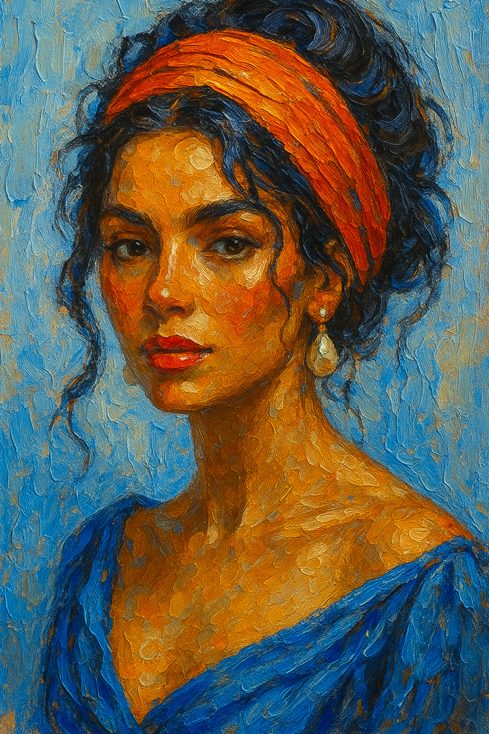 250 €A mesmerizing fusion of geometric abstraction and human expression, this portrait encapsulates tranquility and strength. The subject’s closed eyes convey a deep sense of introspection, while bold color contrasts—lush greens, fiery reds, and deep blacks—create an arresting visual balance. The circular red shape behind the head suggests a halo, symbolizing enlightenment, warmth, or an internal radiance. A single extended earring adds an element of elegance, subtly breaking the symmetry. This modernist piece invites the viewer to contemplate the harmony between identity, culture, and emotion.