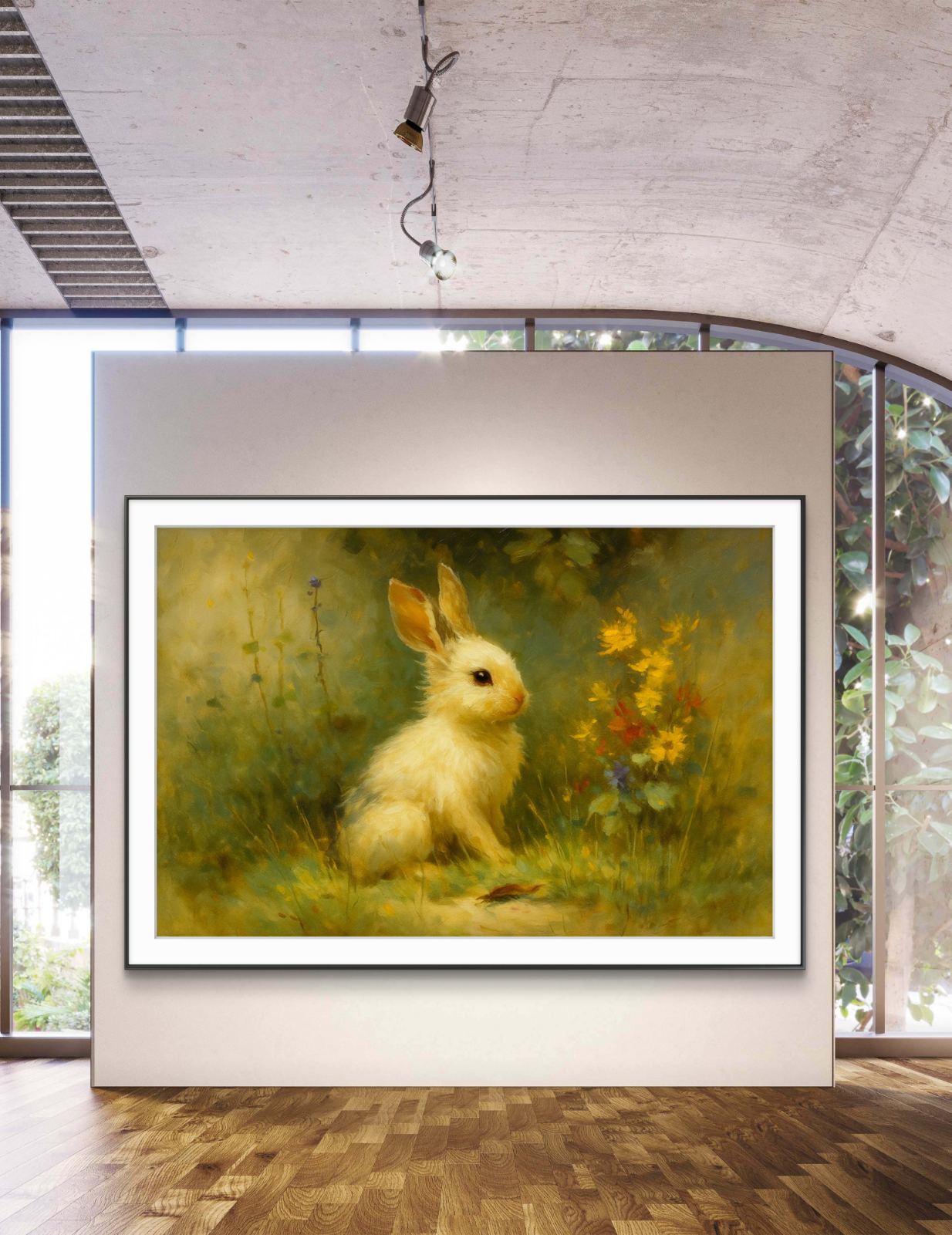 80 €This enchanting painting captures a soft and serene moment in nature, with a young rabbit sitting calmly in a meadow surrounded by wildflowers. The gentle brushstrokes create a dreamlike atmosphere, with delicate hints of yellow and green blending together. The rabbit’s innocent expression and the surrounding blooms evoke a peaceful and tranquil scene, offering a glimpse into the beauty of wildlife in a quiet corner of the world.