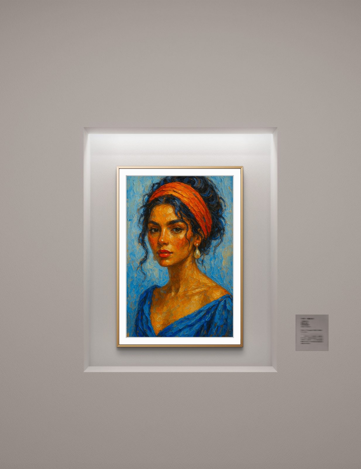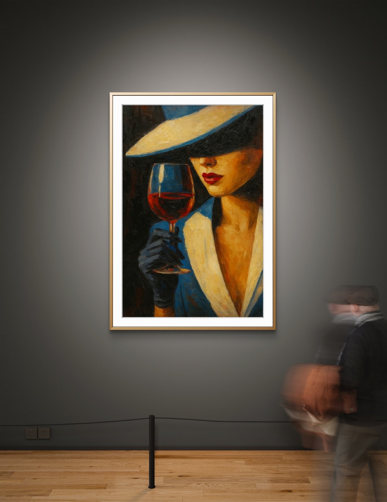 100 €This sophisticated portrait portrays a woman in a moment of quiet allure, as she delicately holds a glass of red wine. Her face is partially obscured by a wide-brimmed hat, adding an air of mystery and intrigue. The bold contrast of deep shadows and soft, warm highlights accentuates her elegant posture and striking red lips. The black gloves and blue dress enhance the sense of refined elegance, while the glowing wine in her hand brings a touch of sensuality to the composition. The piece evokes a sense of timeless glamour, capturing a fleeting yet powerful moment of quiet confidence.