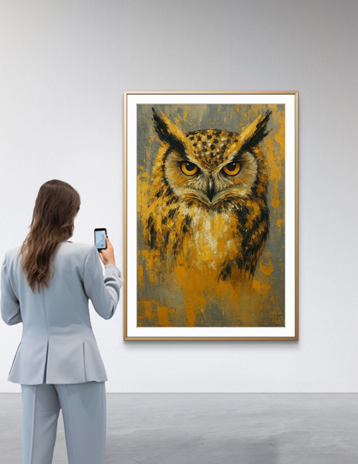 100 €This striking painting of an owl captures its intense gaze, with sharp, piercing eyes that seem to hold a deep, mysterious wisdom. The artist uses bold, textured brushstrokes in rich yellows, oranges, and grays, creating a dynamic contrast between the subject and the background. The owl’s feathers are rendered with intricate details, adding depth and life to the piece, while the dramatic color palette enhances its commanding presence. The combination of stylized abstraction and natural detail makes this artwork both captivating and thought-provoking, symbolizing knowledge, intuition, and vigilance.