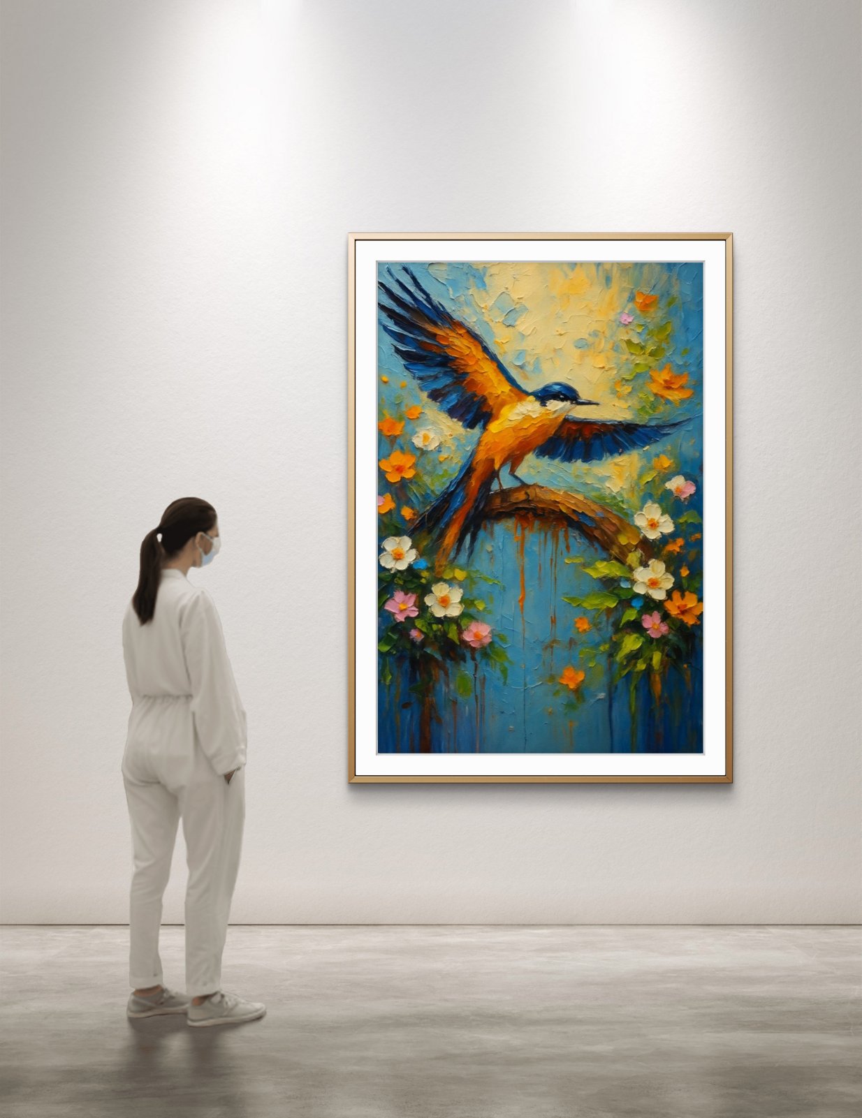 100 €This vibrant oil painting captures the graceful flight of a kingfisher, its wings spread wide as it soars through a backdrop of soft blues and gentle yellows. The bird, with rich hues of orange and deep blue, is framed by lush, blooming flowers, infusing the piece with an aura of serenity and natural beauty. The textured brushwork adds a dynamic depth to the scene, while the cascading floral elements evoke a sense of life and vitality. The subtle dripping of paint enhances the impression of movement and freedom, offering a lively, yet peaceful portrayal of nature in motion.