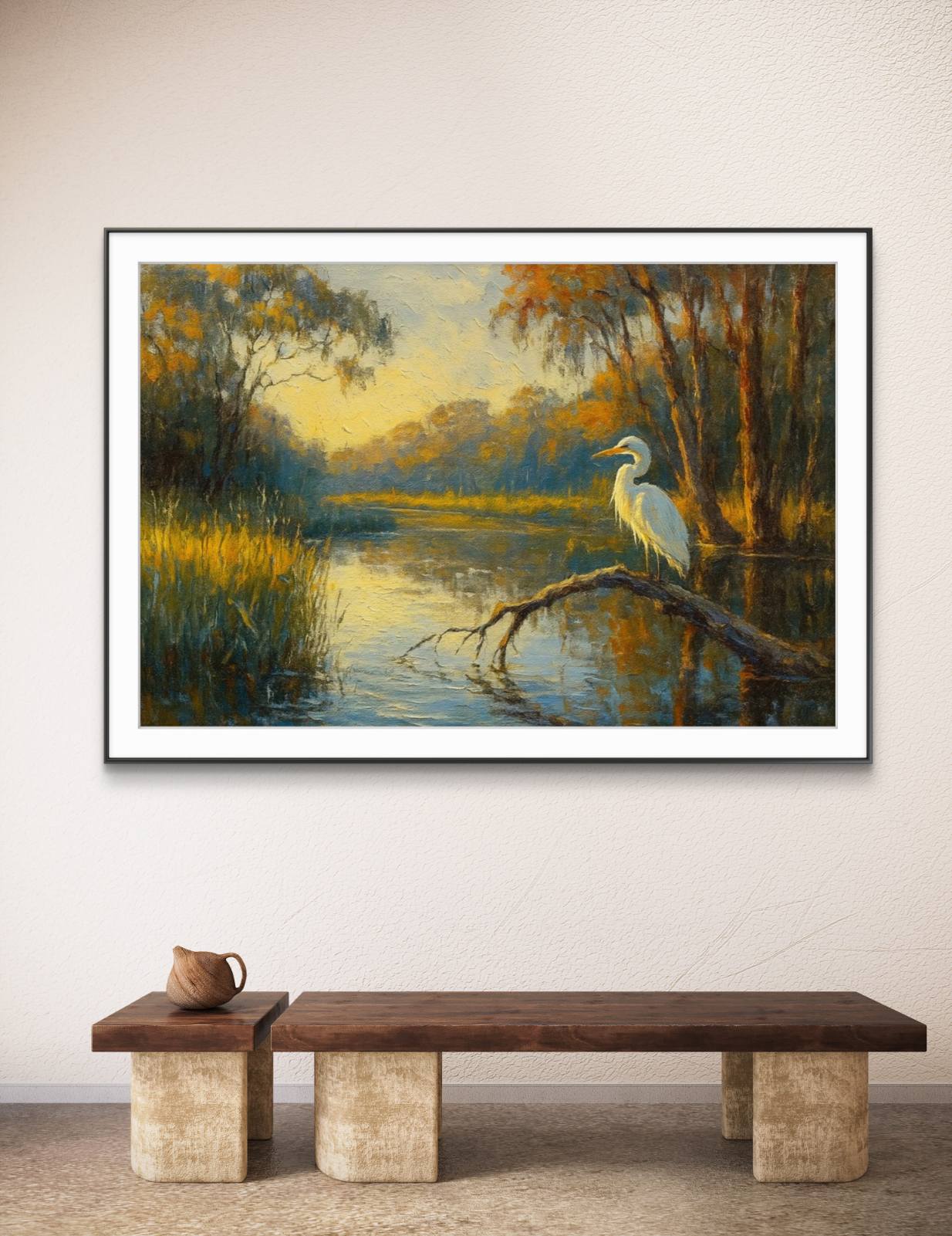 80 €This serene oil painting features a majestic heron perched on a branch above a peaceful river, surrounded by the rich colors of autumn. The soft golden light from the setting sun casts a warm glow across the landscape, reflecting beautifully in the calm waters below. The trees lining the riverbank are dressed in autumn hues, their branches gently swaying in the breeze. The heron stands as a silent observer, adding a sense of tranquility to the scene, while the artist’s careful brushstrokes enhance the stillness and beauty of this quiet moment in nature.