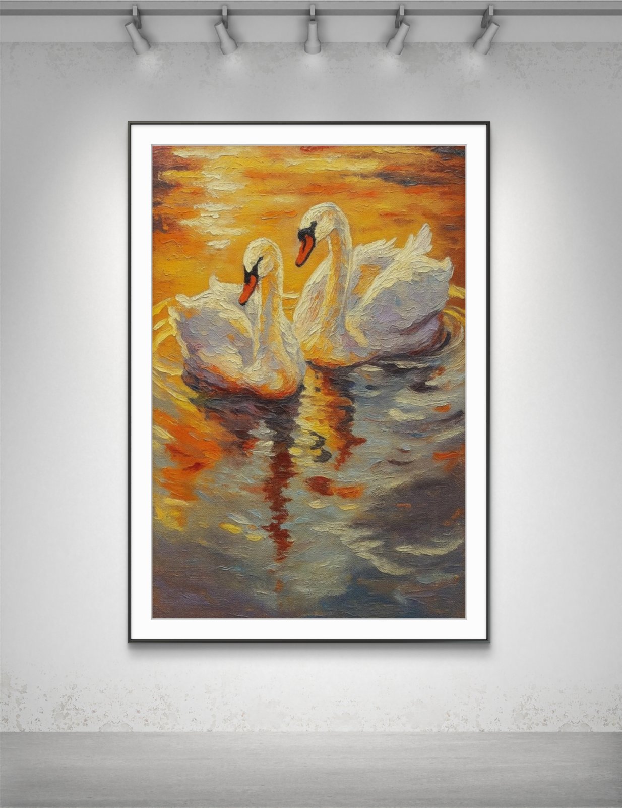 80 €This vibrant oil painting depicts two swans gliding gracefully across a shimmering body of water, their elegant forms reflected in the golden hues of the setting sun. The warm tones of orange, red, and yellow blend beautifully with the soft white of the swans’ feathers, creating a romantic and serene atmosphere. The smooth, rippling water reflects the colors of the sky, enhancing the sense of calm and harmony. The image evokes a sense of timeless beauty, symbolizing peace, love, and the tranquility of nature.